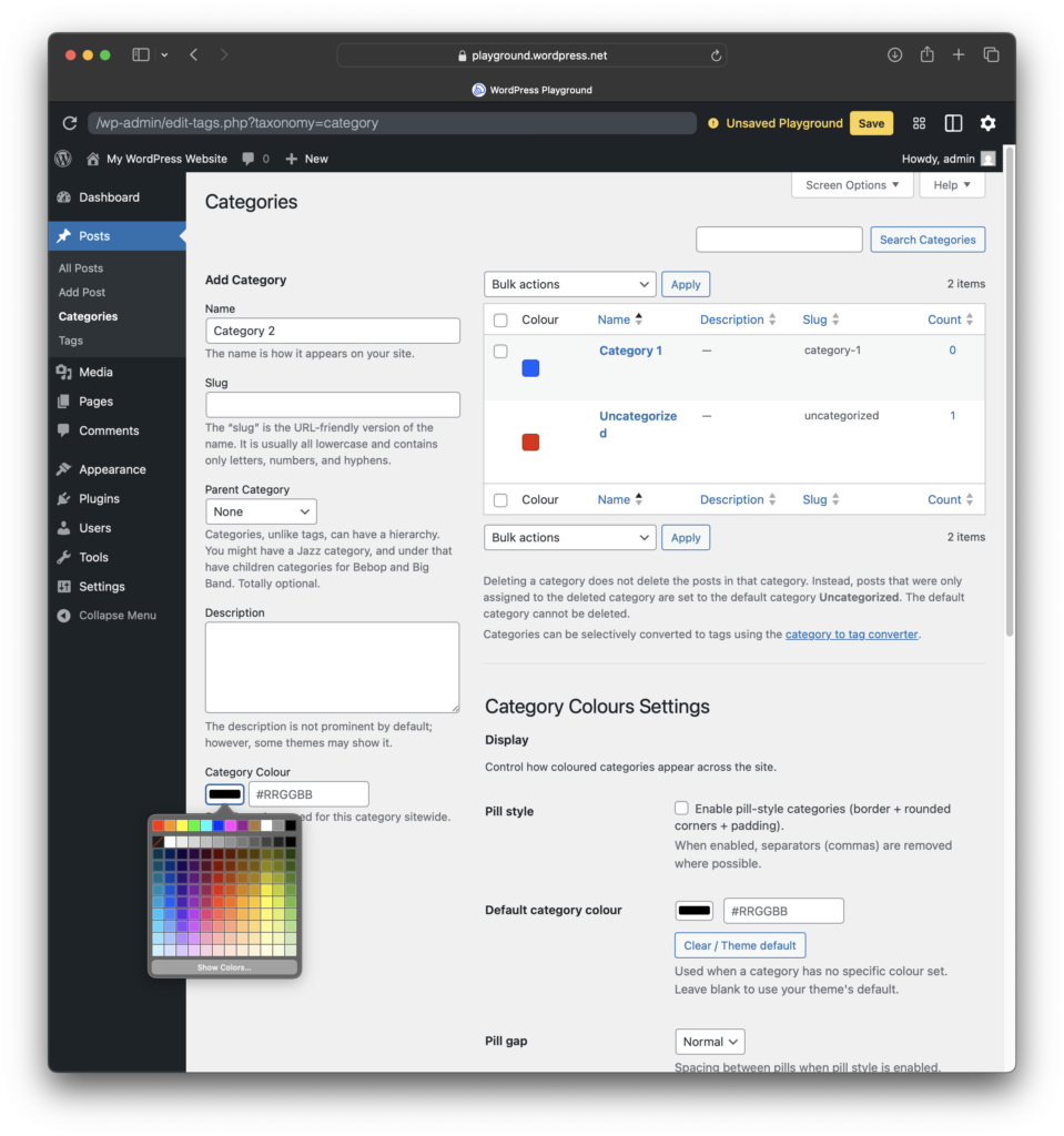 • Set a colour per category on Posts → Categories (add or edit), plus Quick Edit support.