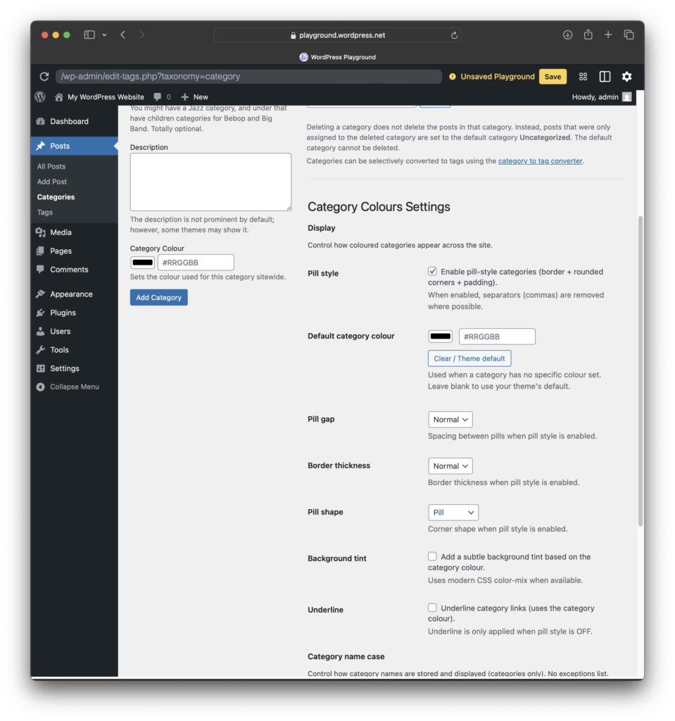 It is designed to be simple in day-to-day use. Set a colour once on the category screen and you are done. If you want a consistent “category pill” look across themes, you can optionally enable pill styling and fine-tune spacing, tint, underline, border thickness, and pill shape.